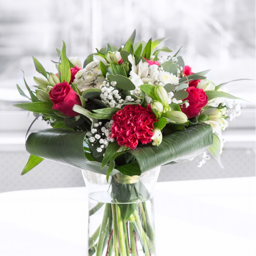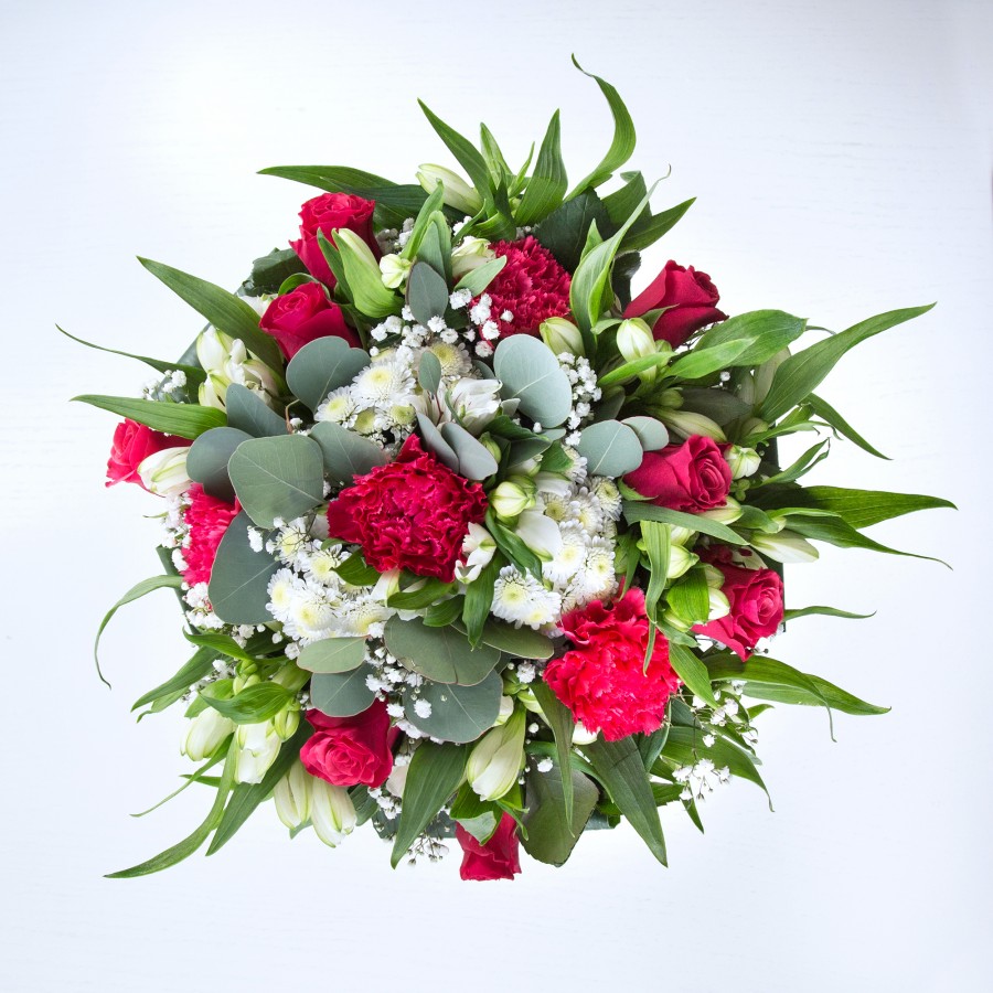 Delight in the serene elegance of this meticulously arranged bouquet. Featuring a refined composition of hand-selected blooms, it brings together crisp white chrysanthemums, soft gypsophila, deep red roses, charming carnations, elegant white alstroemeria, and soothing aspidistra leaves. Every flower is chosen to ensure vibrant freshness and an exquisite presentation.